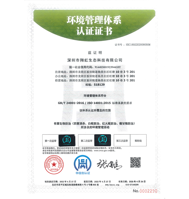 深圳市翔虹生態(tài)科技有限公司成立于1995年,是深圳最早成立的專業(yè)蟲害防治公司之一。公司發(fā)展至今獲得全國有害生物防制服務(wù)A級(jí)資質(zhì)、廣東省有害生物防制服務(wù)A級(jí)資質(zhì)、深圳市有害生物防制服務(wù)A級(jí)資質(zhì)、廣東省有害生物防制服務(wù)A級(jí)資質(zhì)、深圳市有害生物防制服務(wù)甲級(jí)資質(zhì)的單位,是中國有害生物防治協(xié)會(huì)會(huì)員、廣東省有害生物防治協(xié)會(huì)會(huì)員、深圳市有害生物防治協(xié)會(huì)理事單位,多次獲得“深圳市十佳消殺單位”榮譽(yù)。